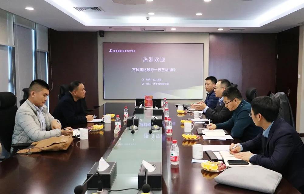 签约前,千秋建筑总经理姜文祥一行到建华建材集团总部进行交流。建华建材总裁何海平、建华建材山西区域总经理高杰、建华建材投资发展办公室副总监杨元等领导参加了交流。双方分享了各自企业的发展历程和管理经验,就股权收购达成一致意见。双方均表示,希望以此次合作为开端,进一步探索多元化合作新模式,争取在其他产业和业务层面达成更深入的合作,实现优势互补、互利共赢。