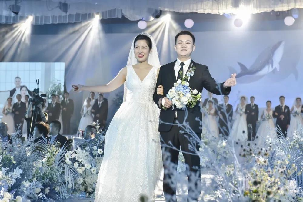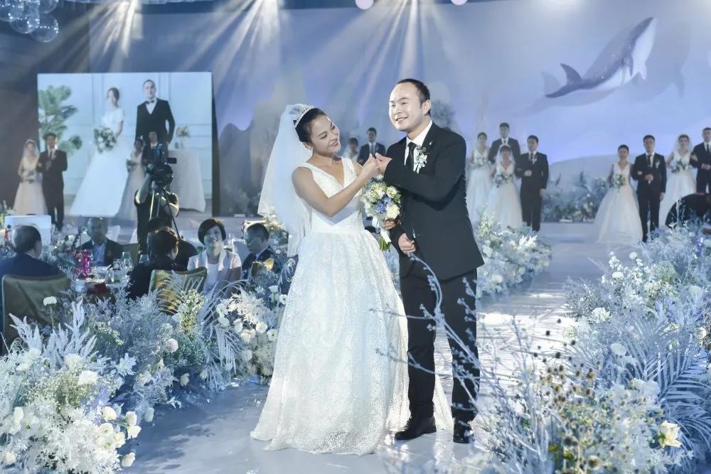 梦境中走出的“海的女儿”拉开梦幻婚礼的序幕,30对新人在“海洋精灵”的引领下依次入场,脸上洋溢着无比幸福的笑容,以默契合拍的舞蹈展示,成为全场焦点。