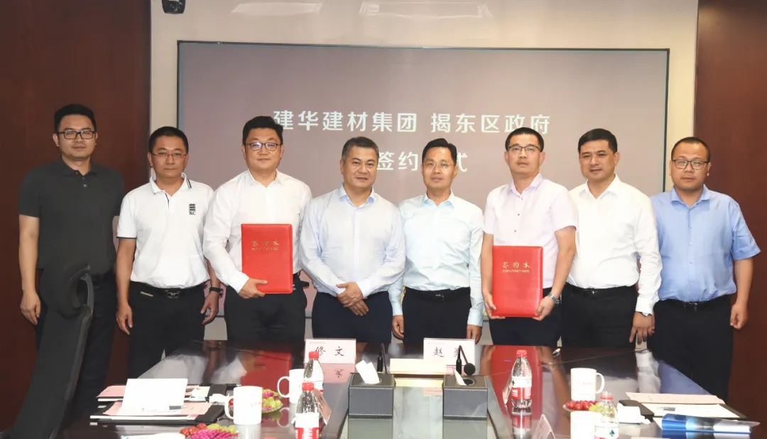 5月25日,建华建材集团与揭阳市揭东区人民政府举行装配式建筑产业基地项目签约仪式。揭东区委书记方烽,区委副书记修文,市招商引资办副主任、中德金属生态城党工委书记、管委会主任林仲龙;建华建材集团董事长王刚、总裁助理兼投资发展办主任汪峰、惠州建华副总经理赵勇、矿产事业部副总经理石柏峰等领导出席签约仪式。