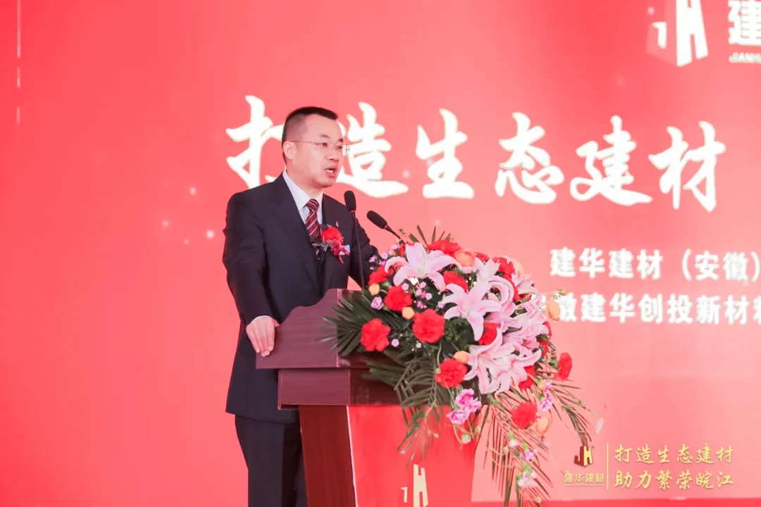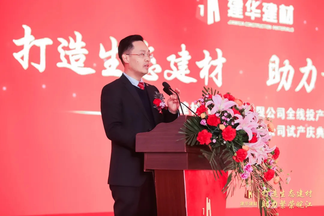 王刚董事长代表集团致辞,他表示安徽建华实现全线投产,同时建华创投试产成功,是建华建材集团在优化产业结构、深化转型升级战略布局中迈出的关键一步。安徽建华要充分发挥上下游产业链优势,全力将安徽建华打造成建华建材集团在长三角地区产品供应的“后花园”、“子弹库”。